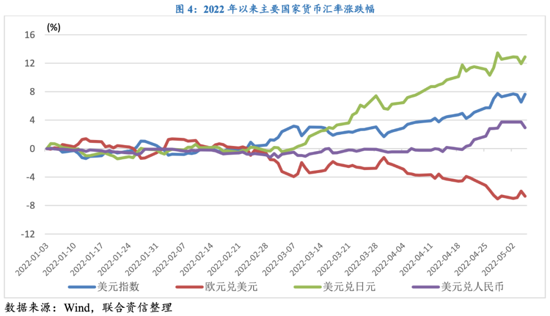 從匯率波動(dòng)情況看,本輪美聯(lián)儲(chǔ)加息對(duì)匯率市場(chǎng)的影響逐步顯現(xiàn),截至2022年3月末,美元的供應(yīng)量為21.9萬(wàn)億美元,本次美聯(lián)儲(chǔ)上調(diào)聯(lián)儲(chǔ)基金利率50個(gè)BP,相應(yīng)帶動(dòng)再貼現(xiàn)率走高;由于貨幣乘數(shù)與再貼現(xiàn)率呈反比,貨幣乘數(shù)隨之下降,預(yù)計(jì)5月末市場(chǎng)上的美元供應(yīng)量將下降至21萬(wàn)億美元左右,繼續(xù)帶動(dòng)美元走強(qiáng)。5月4日,美元指數(shù)一度逼近104關(guān)鍵點(diǎn)位,創(chuàng)近20年以來(lái)新高。在美元指數(shù)走強(qiáng)的背景下,歐元、日元以及人民幣等主要貨幣匯率卻紛紛走跌。歐元方面,歐元區(qū)經(jīng)濟(jì)表現(xiàn)不佳,同時(shí)俄羅斯宣布對(duì)歐洲兩國(guó)禁運(yùn)天然氣,表明俄羅斯和歐盟地區(qū)的緊張關(guān)系再度加劇,歐洲地區(qū)面臨的經(jīng)濟(jì)增長(zhǎng)放緩壓力和地緣政治風(fēng)險(xiǎn)均有所提升,導(dǎo)致歐元承壓下行,5月5日歐元兌美元收于1.0542,創(chuàng)2017年以來(lái)新低。日元方面,由于日本央行繼續(xù)維持超寬松的貨幣政策,日美貨幣政策分化導(dǎo)致日元進(jìn)一步承壓下行,5月5日美元兌日元突破130關(guān)口,創(chuàng)近20年以來(lái)新高。人民幣方面,人民幣自美聯(lián)儲(chǔ)緊縮升溫以來(lái)呈現(xiàn)波動(dòng)走軟態(tài)勢(shì),再加上3月國(guó)內(nèi)停工停產(chǎn)對(duì)出口有所影響以及俄烏沖突背景下外部需求有所走弱,供需兩端承壓對(duì)人民幣走勢(shì)有所拖累,此外中美貨幣政策分化走勢(shì)的繼續(xù)加大導(dǎo)致外資回流美國(guó),進(jìn)一步令人民幣承壓,5月6日離、在岸人民幣匯率雙雙跌破6.65的重要點(diǎn)位。
