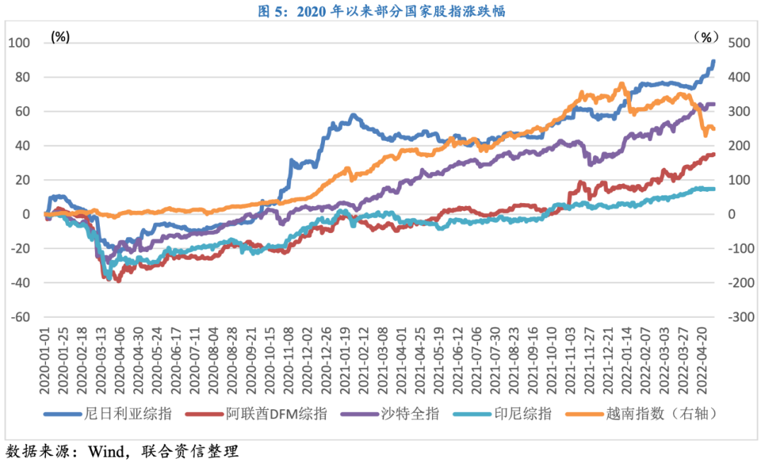本次美聯(lián)儲(chǔ)加息下的國(guó)際資本流動(dòng)具有一些新特征,受歐洲地緣政治風(fēng)險(xiǎn)猶存、日本經(jīng)濟(jì)政策維持相對(duì)寬松以及中國(guó)疫情防控升級(jí)加劇供應(yīng)鏈緊張等因素影響,國(guó)際資本轉(zhuǎn)而流向“資源導(dǎo)向型”以及“雁陣模式升級(jí)型”國(guó)家。一方面,俄烏沖突爆發(fā)加劇了全球糧食危機(jī)、能源供應(yīng)短缺以及全球供應(yīng)鏈緊張,“資源導(dǎo)向型國(guó)家”憑借自身資源充足的稟賦優(yōu)勢(shì)對(duì)俄烏沖突風(fēng)險(xiǎn)形成有效緩沖,因此吸引了大量國(guó)際避險(xiǎn)資本流入。根據(jù)國(guó)際貨幣基金組織(IMF)預(yù)測(cè)數(shù)據(jù),高油價(jià)將有望推動(dòng)沙特經(jīng)濟(jì)邁入高速增長(zhǎng)模式,3月沙特石油產(chǎn)量增至約1,030萬(wàn)桶/天,同比增長(zhǎng)26.7%,被列為該國(guó)近20年來(lái)最快的增速,IMF將2022年沙特的GDP增速預(yù)測(cè)定在了7.6%,較原先預(yù)測(cè)提高了2.8個(gè)百分點(diǎn)。在此背景下,沙特全指自新冠疫情暴發(fā)以來(lái)大幅上漲了64.3%,領(lǐng)跑全球股市表現(xiàn)。此外,其他產(chǎn)油國(guó)(如阿聯(lián)酋以及尼日利亞)也吸引了大量外資流入,助推阿聯(lián)酋DFM綜指以及尼日利亞綜指分別大幅上漲35%和89%。