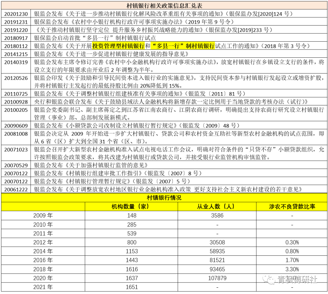 1、2005年與2006年,中共中央、國務(wù)院先后印發(fā)《關(guān)于進(jìn)一步加強(qiáng)農(nóng)村工作提高農(nóng)業(yè)綜合生產(chǎn)能力若干政策的意見》(中發(fā)〔2005〕1號)和《關(guān)于推進(jìn)社會主義新建設(shè)的若干意見》(中發(fā)〔2006〕1號),提出鼓勵在縣域內(nèi)設(shè)立多種所有制的社區(qū)金融機(jī)構(gòu)……有效解決農(nóng)村地區(qū)銀行業(yè)金融機(jī)構(gòu)網(wǎng)點(diǎn)覆蓋率低、金融供給不足、競爭不充分等問題,算是為村鎮(zhèn)銀行登上舞臺正式鋪路。