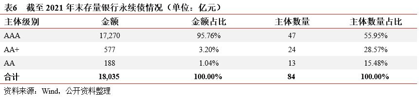 由于保險公司永續債可能歸屬為權益工具,投資者群體將受到一定限制,預計發行難度和發行成本較資本補充債有所上升,前期保險公司永續債發行主體或將以大型優質險企為主。保險公司永續債具有次級屬性,包含損失吸收條款,整體條款設計與銀行永續債較為相似,中國銀行于2019年1月25日發行了第一支銀行永續債“19中國銀行永續債01”,從存量銀行永續債來看,截至2021年末,存量銀行永續債余額合計18,035億元,其中主體評級為AAA的占比為95.76%,主體評級為AA+的占比為3.20%,可見銀行永續債發行主體整體資質較高。保險公司作為持牌金融機構,整體資質相對較好,頭部險企的資信等級較高,從銀行永續債的發行歷程及現狀來看,中短期內保險公司永續債或將以大型優質險企為主。