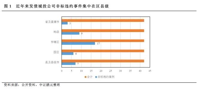 事實上,縣級城投公司確實通過融資租賃、信托等開展了較多的非標融資,不僅融資成本高企,而且還存在“短借長用”帶來的期限錯配風險。疊加非標融資的私募屬性,很多縣級城投公司在償債資金不足的情況下都傾向于對非標融資進行選擇性違約,這就導致縣級城投公司的非標頻頻“爆雷”。據不完全統計,從2018年非標監管趨嚴至2020年末,市場上共計發生90余起城投公司(含未發債城投公司)非標違約事件,其中區縣級(含園區)城投公司發生非標違約的次數占比接近80%(縣及縣級市、園區、市轄區占比分別為48.72%、10.26%、19.66%);共計發生40余起發債城投公司非標違約事件,其中區縣級(含園區)發債城投公司發生非標違約的次數占比超過70%(見圖1),呈現出明顯的向低行政級別城投集中的態勢。雖然目前非標違約尚未對城投債形成快速傳導,但毫無疑問非標違約的縣級城投公司面臨著更大的債務違約風險。