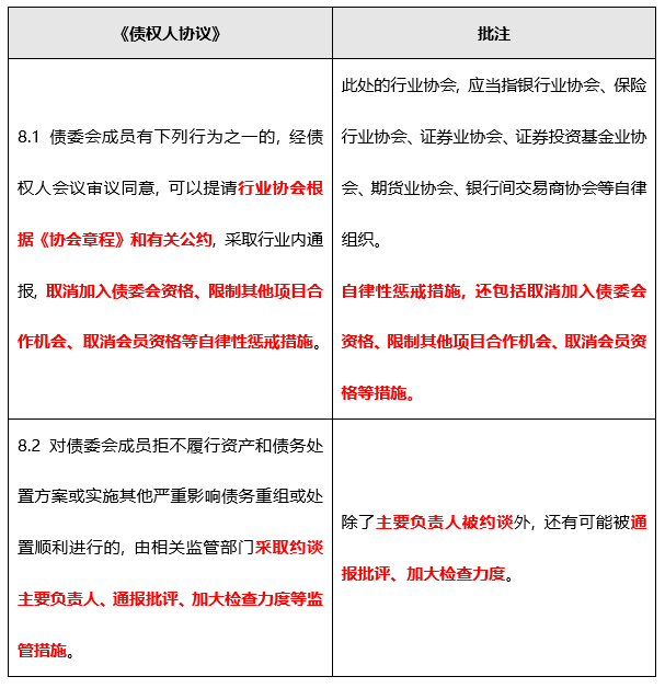 當然如果我們進一步去看債權人協(xié)議, 就會發(fā)現(xiàn)在不同債權人協(xié)議中往往還會對自律懲戒措施和行政監(jiān)管機構有可能采取的措施有進一步的列舉, 以某個金融機構債權人委員會的債權人協(xié)議第8條違約條款的規(guī)定為例: