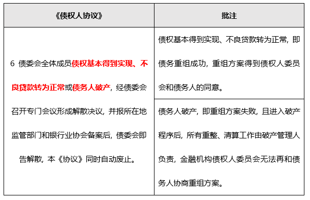 所以, 總的來說, 金融機構債權人委員會所主導的債務重組徹底成功(債權基本得到實現(xiàn)、不良貸款轉(zhuǎn)為正常)或者徹底失敗(債務人破產(chǎn))的情況下, 金融機構債權人委員會都有可能解散。