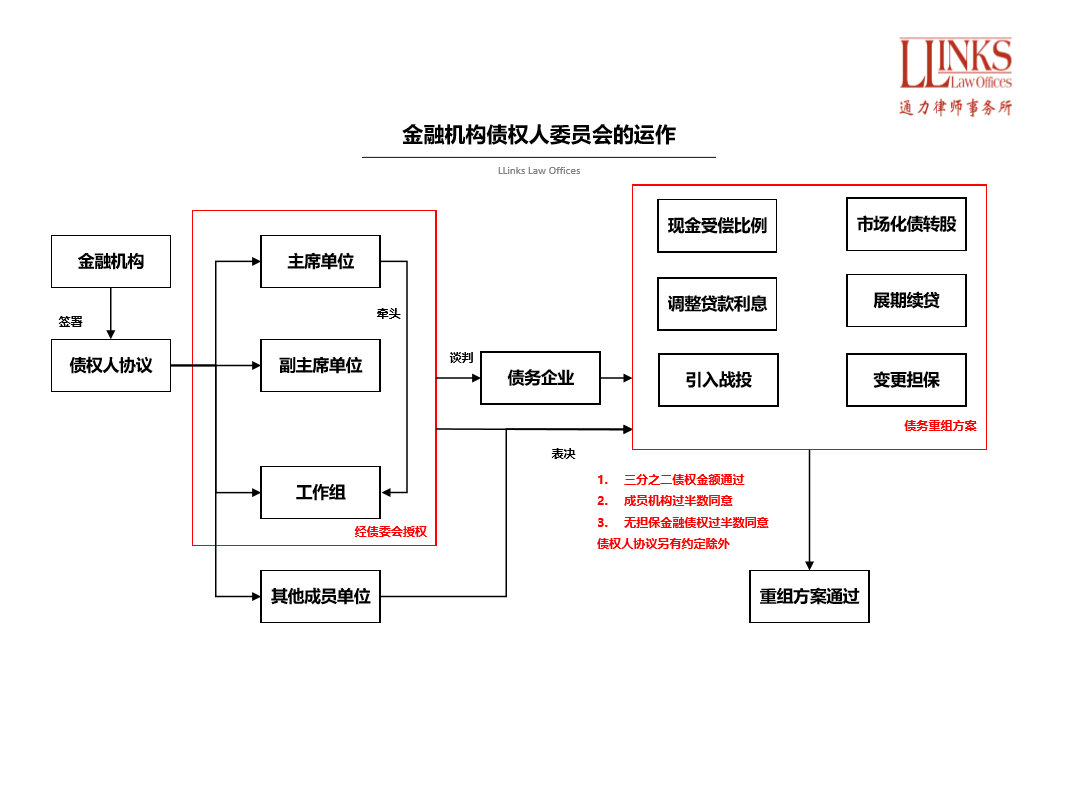 此處我們需要特別提醒大家注意的是, 在我們此前遇到的幾個金融機構債權人委員會中, 其債權人協(xié)議均未約定“并且其所代表的債權額占無財產(chǎn)擔保金融債權總金額半數(shù)以上”的表決條件, 那么既然該等規(guī)定明確了“債權人協(xié)議另有約定的除外”, 那么該等金融機構債權人委員會通過重組方案的條件就只有三分之二金額和半數(shù)成員機構同意了。