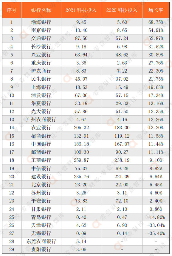 各銀行近年來積極加大科技投入,主要應用在加快銀行的數字化、智能化轉型,提升專業化水平和服務效率、強化科技研發能力、完善風險管理水平等方面,29家銀行的科技投入數據和排名情況如下: