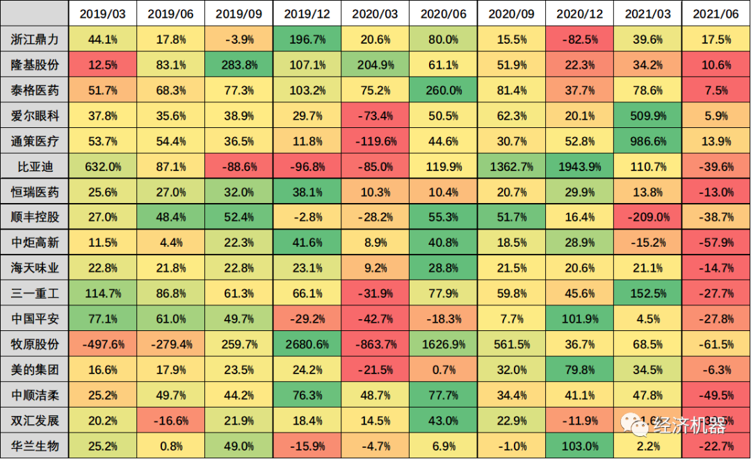 4)部分核心資產“業績暴雷”,或者邏輯出現松動,一般會出現經典的“戴維斯雙殺”。半年報顯示,大批核心資產股票業績出現暴雷,數量之多,幅度之大,歷史上也是不多見的。一些大牛股,比如海天味業、恒瑞醫藥等過去十年,從來未出現過當季凈利潤同比出現負增長,但今年都出現了(圖8)。這里面有行業新政的因素(比如帶量采購),有高基數的因素,也有整體環境因素。不管怎么說,一旦業績出現暴雷,處于估值高位的核心資產,必會出現經典的“戴維斯雙殺”,經歷“股價下跌-PE下降-盈利下跌-PE上升-股價進一步下跌-PE回落”等幾個階段。目前來看,部分暴雷核心資產估值仍然虛高,仍有進一步殺估值的空間。