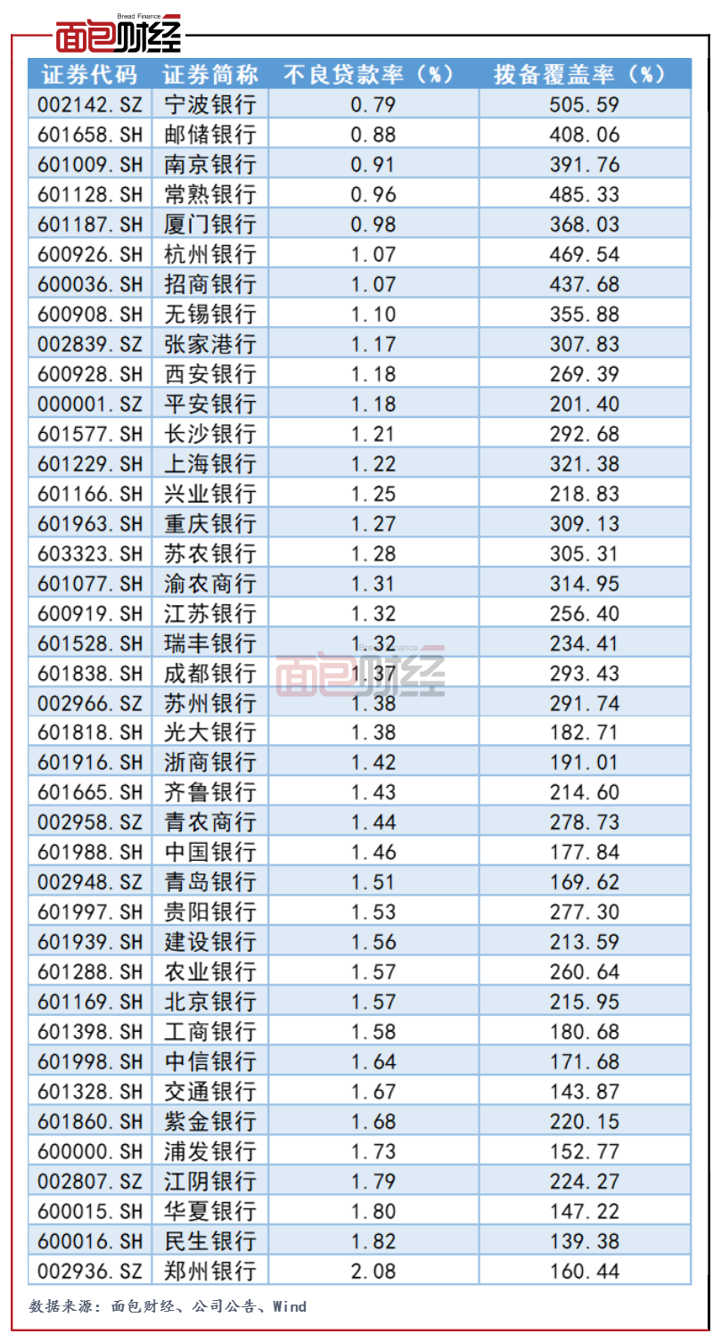 與其他上市銀行相比,寧波銀行的資產質量優勢較為明顯。由于多數銀行暫未發布中報業績,以2020年年末數據來看,寧波銀行的不良貸款率最低,而撥備覆蓋率則處于上市銀行之首。