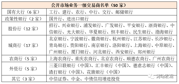 央行會(huì)在每年的4月底公布最新年度的公開市場業(yè)務(wù)一級交易商名單。最新的公開市場業(yè)務(wù)一級交易商名單有50家