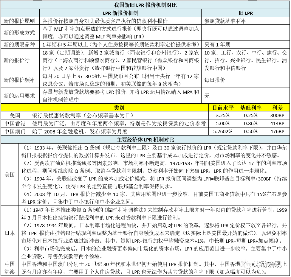(3)和2013年推出的LPR相比,LPR新報(bào)價(jià)機(jī)制有諸多創(chuàng)新之處,主要體現(xiàn)在報(bào)價(jià)原則(基于最優(yōu)客戶)、形成方式(MLF加點(diǎn))、期限品種(1年和5年以上)、報(bào)價(jià)行(數(shù)量更多且類型更豐富)、報(bào)價(jià)頻率(固定于每月20日)以及新的運(yùn)用要求(通過MPA和自律機(jī)制管理)來強(qiáng)化約束等方面。