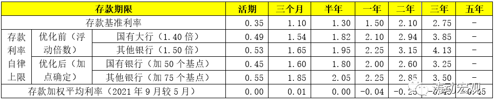 2021年6月21日,市場利率定價(jià)自律機(jī)制將存款利率上限由存款基準(zhǔn)利率浮動(dòng)倍數(shù)調(diào)整為加點(diǎn)確定(詳情參見存款利率報(bào)價(jià)方式調(diào)整全解),目前為止已施行5個(gè)月左右。具體看,2年期及以上的長期定期存款利率明顯下降,9月新發(fā)生定期存款加權(quán)平均利率為2.21%、同比下降17BP、較今年5月下降28BP。其中,2年期、3年期和5年期定期存款利率較5月份分別下降25BP、43BP和45BP。