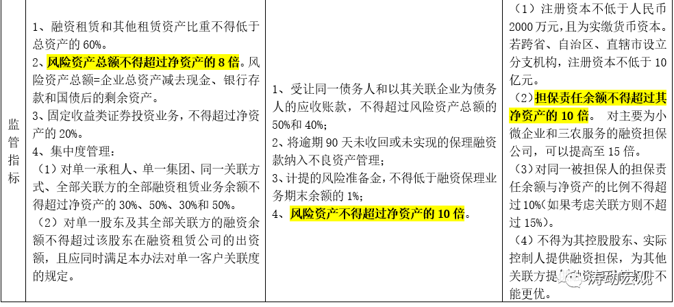 (1)在明確主營業(yè)務(wù)、禁止負(fù)面清單以及限制資金來源之外,政策還在杠桿水平上給予了明確限制,以避免類金融機(jī)構(gòu)過度擴(kuò)張,例如政策明確指出融資租賃、商業(yè)保理以及融資擔(dān)保的風(fēng)險(xiǎn)資產(chǎn)總額(或擔(dān)保責(zé)任余額)分別不得超過其凈資產(chǎn)的8倍、10倍和8倍,因此8-10倍的杠桿水平基本上是政策標(biāo)配。
