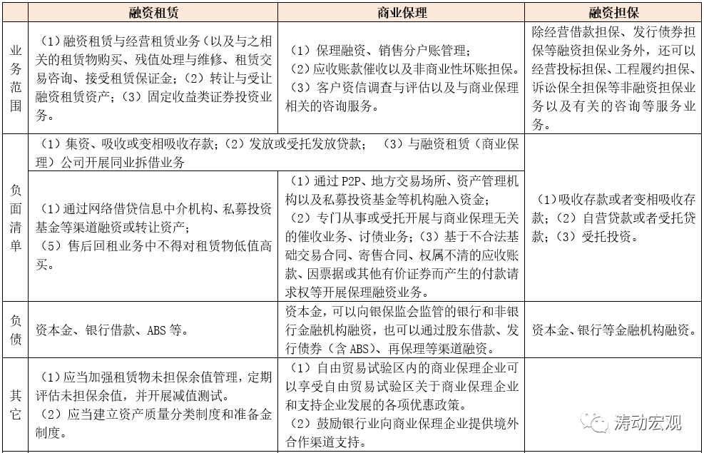 (1)在業(yè)務(wù)范圍上,除主營業(yè)務(wù)外,融資租賃公司還可以開展固定收益類證券投資業(yè)務(wù),融資擔(dān)保公司既可以開展融資性擔(dān)保業(yè)務(wù)亦可以開展非融資性擔(dān)保業(yè)務(wù),商業(yè)保理公司則可以開展保理融資、銷售分類賬管理、應(yīng)收賬款催收、客戶資信調(diào)查等。