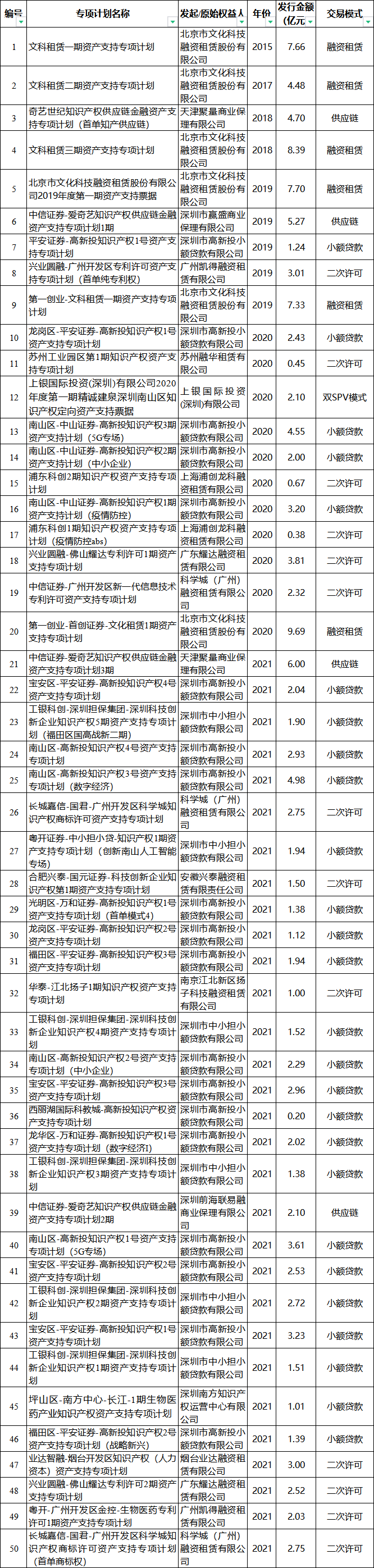 據(jù)不完全統(tǒng)計,目前羅湖區(qū)、寶安區(qū)、福田區(qū)、南山區(qū)、龍崗區(qū)均已出臺相關(guān)補貼政策。深圳市首創(chuàng)“國資主導(dǎo)、政府補貼、市場參與、企業(yè)獲益”的知識產(chǎn)權(quán)證券化模式,采用“小額貸款+專項計劃”交易結(jié)構(gòu),由深圳市中小擔(dān)小額貸款有限公司/深圳市高新投小額貸款有限公司作為原始權(quán)益人,深圳市高新投融資擔(dān)保有限公司/深圳市深擔(dān)增信融資擔(dān)保有限公司作為增信機構(gòu),以22單證券化產(chǎn)品、54.27億元發(fā)行金額領(lǐng)跑全國。