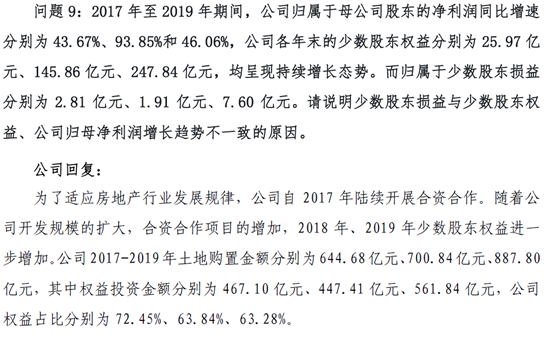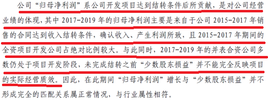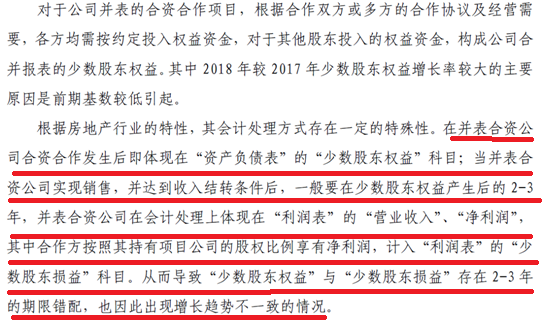 不可以。很多賣方的報告是存在錯誤的。應該說明股實債會導致權(quán)益比和損益比之間存在差異,但并不能說這兩個指標之間存在差異就是因為明股實債,因為導致這兩個指標產(chǎn)生差異的原因有很多,并且最核心的因素也不是明股實債。比如我們在文首指出的地產(chǎn)公司由于預收制度的存在導致收入確認和利潤分配存在滯后。也就是說,這兩年合作開發(fā)比較多,那么非并表全資子公司的投入在當期就計入了少數(shù)股東權(quán)益,但是這些項目要達到收入確認條件至少是2-3年之后的事情,因此這就會造成權(quán)益比和損益比之間出現(xiàn)差異。也就是說,小股東雖然現(xiàn)在出資了,但是分配利潤要等到2-3年之后,這就會使得當期的少數(shù)股東損益占比小于少數(shù)股東權(quán)益占比。結(jié)合現(xiàn)實情況可知,合作開發(fā)也就是17年逐步開始出現(xiàn)的,也就是說,17年合作的項目,當年小股東的投入已經(jīng)計入了少數(shù)股東權(quán)益,但是這些項目要達到結(jié)轉(zhuǎn)條件基本要到2020年,所以在利潤表上是這幾年都不會有分配,這個原因是造成這幾年二者之間差異的最重要原因。此外,還有其他因素會導致這一差異,比如不同項目之間盈利情況是存在差異的,比如有的小股東在達到收入確認條件前會提前退出等等。