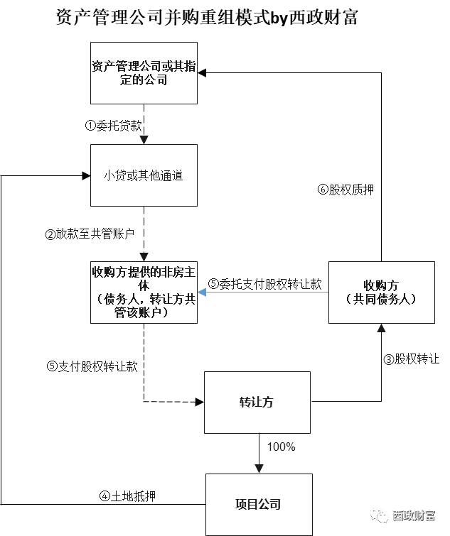 4.還款主體:非房主體作為借款人,收購(gòu)方作為共同債務(wù)人對(duì)AMC或其指定主體承擔(dān)還本付息義務(wù)。此外,后期還款亦可由項(xiàng)目公司承接借款主體的債務(wù),項(xiàng)目公司代替借款主體履行還本付息義務(wù)。