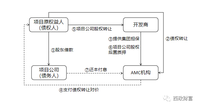 2.AMC向項(xiàng)目原權(quán)益人支付的債權(quán)轉(zhuǎn)讓對(duì)價(jià)款作為項(xiàng)目原權(quán)益人和開(kāi)發(fā)商之間的實(shí)際股權(quán)轉(zhuǎn)讓對(duì)價(jià),項(xiàng)目公司完成股權(quán)轉(zhuǎn)讓變更登記后后置質(zhì)押至AMC名下。