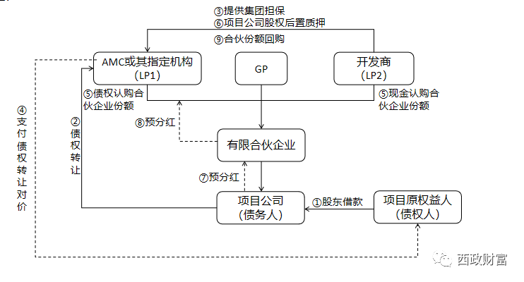 2.AMC或其指定主體與開(kāi)發(fā)商共同設(shè)立有限合伙企業(yè),合伙企業(yè)的GP由AMC指定,AMC或其指定主體以收購(gòu)的項(xiàng)目原權(quán)益人的債權(quán)認(rèn)購(gòu)有限合伙企業(yè)的份額,開(kāi)發(fā)商以現(xiàn)金認(rèn)購(gòu)有限合伙企業(yè)的份額,具體份額比例可另行協(xié)商,有限合伙收購(gòu)項(xiàng)目公司股權(quán)之后做后置質(zhì)押。