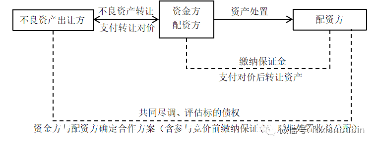 該類業(yè)務(wù)一般涉及三方當(dāng)事人,即出讓方(原債權(quán)持有人,一般為擬組包轉(zhuǎn)讓不良資產(chǎn)的金融機(jī)構(gòu)),資金方(一般為擁有資金優(yōu)勢(shì),且能夠在不良資產(chǎn)一級(jí)市場(chǎng)上開展不良資產(chǎn)批量收購(gòu)的經(jīng)營(yíng)機(jī)構(gòu)),配資方(一般為擁有較強(qiáng)不良資產(chǎn)處置能力和資源整合能力的民間經(jīng)營(yíng)機(jī)構(gòu)),資金方與配資方合稱“受讓方”。其交易邏輯如下: