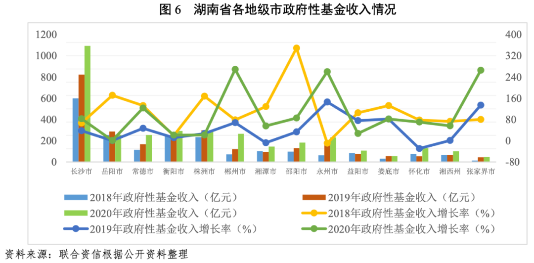 從各地級市政府財力對“發債城投企業全部債務+地方政府債務”的覆蓋程度來看,2020年,地方一般公共預算收入、政府性基金收入和地方綜合財力對“發債城投企業全部債務+地方政府債務”覆蓋程度相對較低的城市為湘潭市、株洲市、郴州市、常德市和岳陽市,覆蓋程度相對較高的為長沙市、永州市、湘西州和邵陽市。