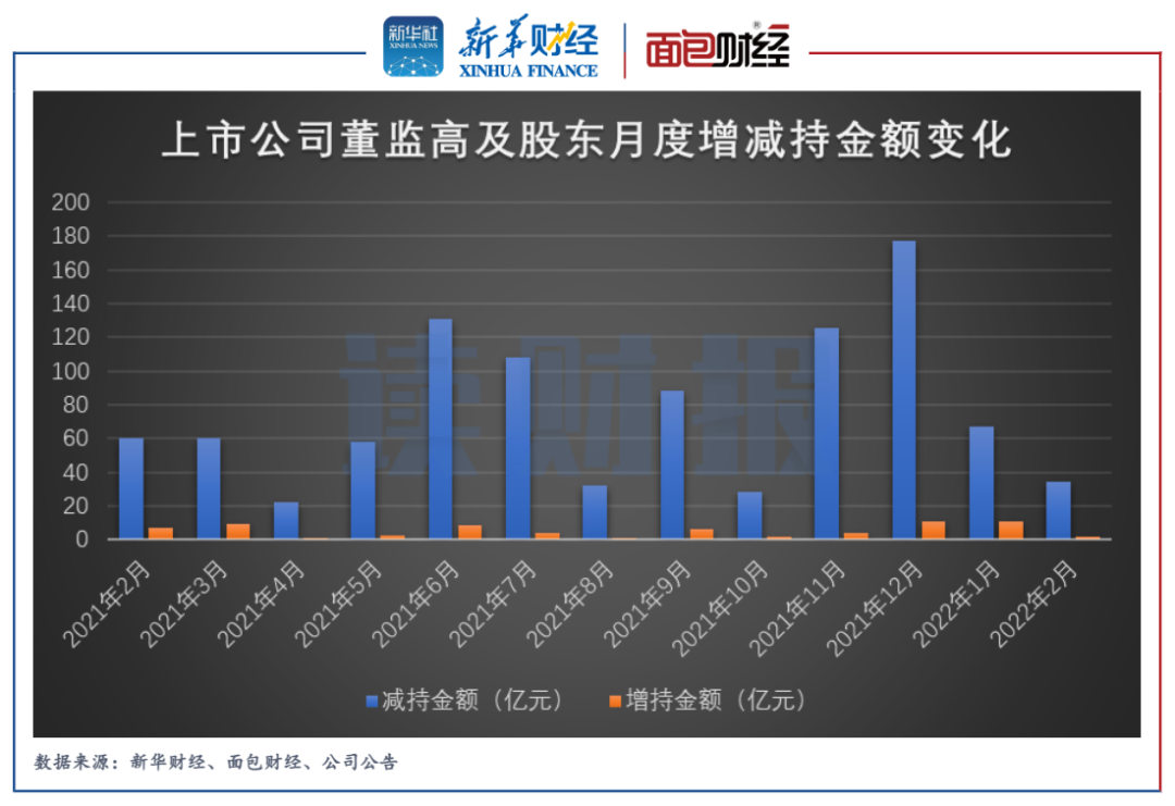 新華財經(jīng)和面包財經(jīng)根據(jù)上市公司的信披數(shù)據(jù)統(tǒng)計,2022年2月,滬深兩市上市公司董監(jiān)高及其關(guān)聯(lián)人減持金額合計約34.13億元,涉及128家公司;增持金額合計約1.82億元,涉及38家公司。增、減持金額相抵之后,凈減持金額32.31億元。