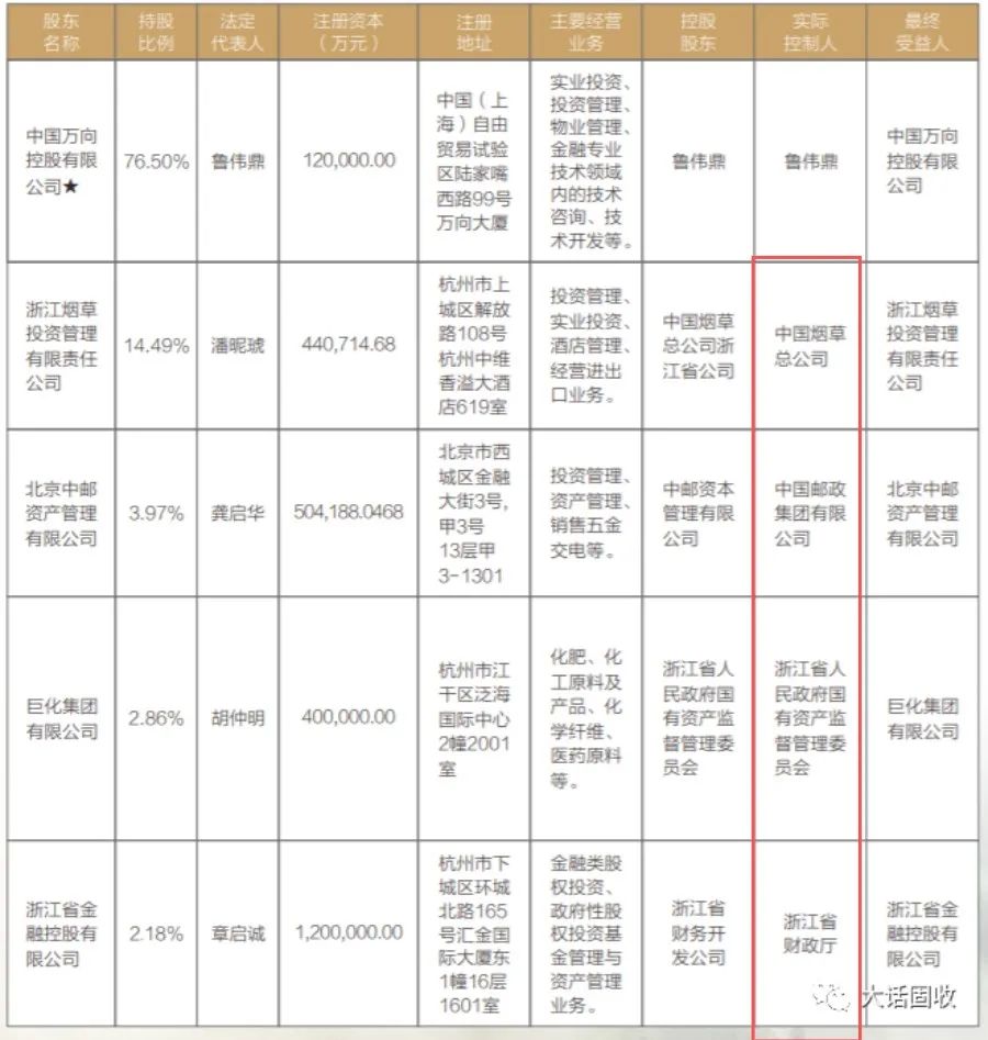 不一樣的不在于大股東,而在于其他幾個小股東,來頭都“不小”;第二大股東浙江煙草投資,實(shí)控人是中國煙草總公司;第三大股東中國中郵,實(shí)控人是中國郵政集團(tuán);末位倆股東,實(shí)控人分別是浙江省國資委和浙江省財政廳。