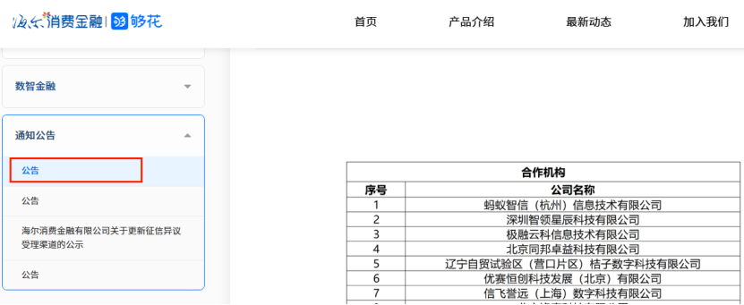 螞蟻消金、招聯金融等則直接將合作機構公示置于官網底部,雖無歷史披露信息,但入口直觀,成為行業信披的標桿案例。