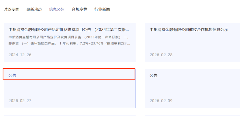 其中,中郵消金和海爾消金的披露內容均隱藏在標題僅為“公告”文件中,前者需逐一點開新頁面查找,后者雖可在右側直接顯示,但仍增加了消費者獲取信息的成本。