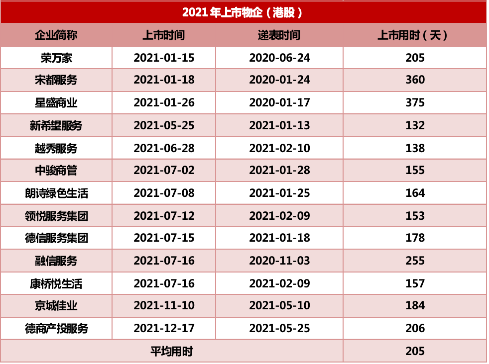 從審批節(jié)奏來(lái)看,物企獲批進(jìn)度放緩,同比延后約68天。根據(jù)克而瑞物管和中物研協(xié)統(tǒng)計(jì),2020年17家在港交所上市的物企從初次交表到成功上市平均歷時(shí)137天,而2021年上市的13家物企平均用時(shí)205天。