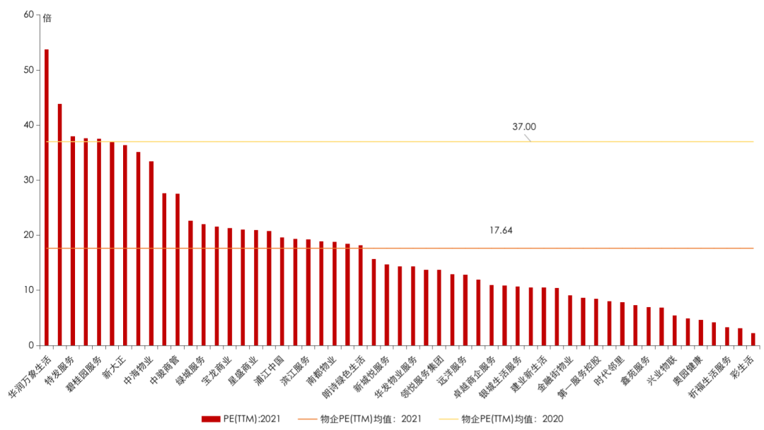 下半年,資本市場(chǎng)遇冷,據(jù)克而瑞物管統(tǒng)計(jì),至2021年末物業(yè)板塊PE均值僅為17.64倍,相較2020年末(37.00倍)降幅達(dá)52.31%。其中,市盈率最高的是華潤(rùn)萬(wàn)象生活,為53.72倍,較去年底下滑64.36%;市盈率最低的彩生活,為2.26倍,較去年底下滑74.66%。