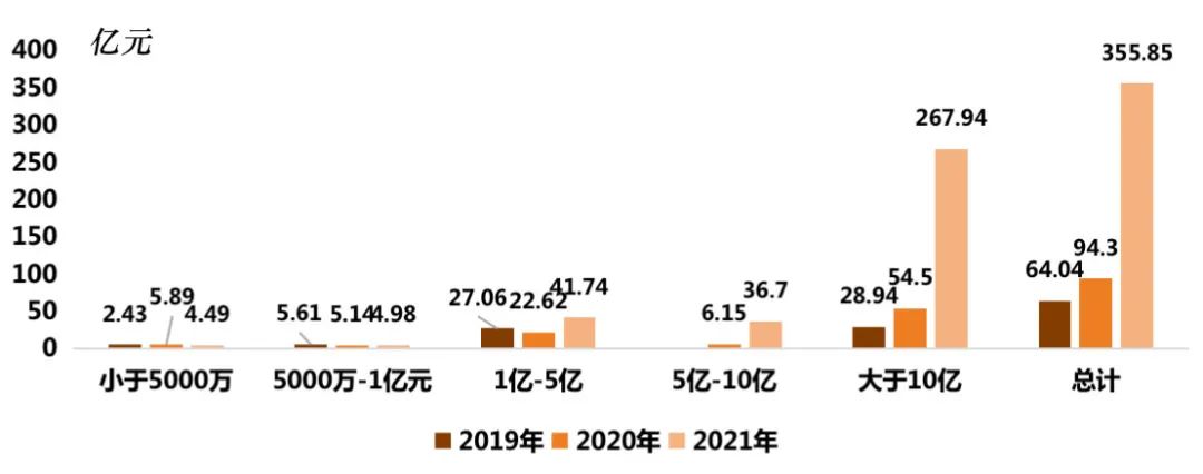 截至2021年12月31日,1-5億,5-10億元,以及10億元以上的并購(gòu)事項(xiàng)(19項(xiàng)、5項(xiàng)和7項(xiàng))均較上年同期增多(10項(xiàng)、1項(xiàng)和3項(xiàng));并購(gòu)金額分別為41.75億元、36.70億元和267.94億元,分別較上年同期增長(zhǎng)84.54%、497.11%和391.68%,并購(gòu)事項(xiàng)及并購(gòu)總額均顯著增加。