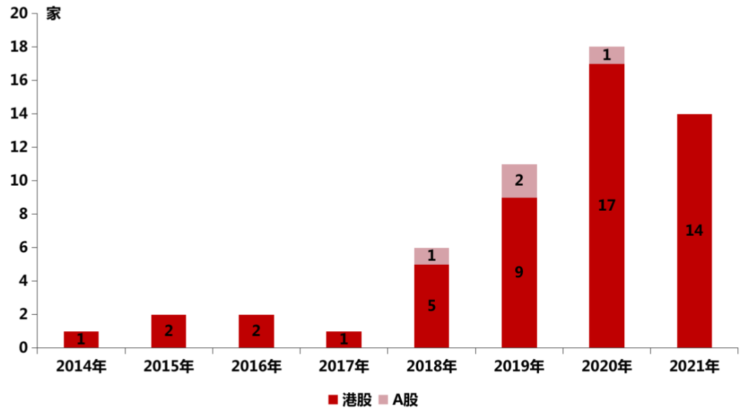 從遞表企業(yè)來(lái)看,2021年行業(yè)遞表物企數(shù)達(dá)34家,為迄今為止遞表企業(yè)最多的一年,但從實(shí)際推進(jìn)進(jìn)程來(lái)看,年內(nèi)遞表并成功上市的僅有9家。此外,年內(nèi)新增上市物企共14家(其中13家為常規(guī)IPO上市,均為港股物企),較上年18家減少4家,未及預(yù)期。