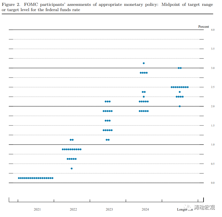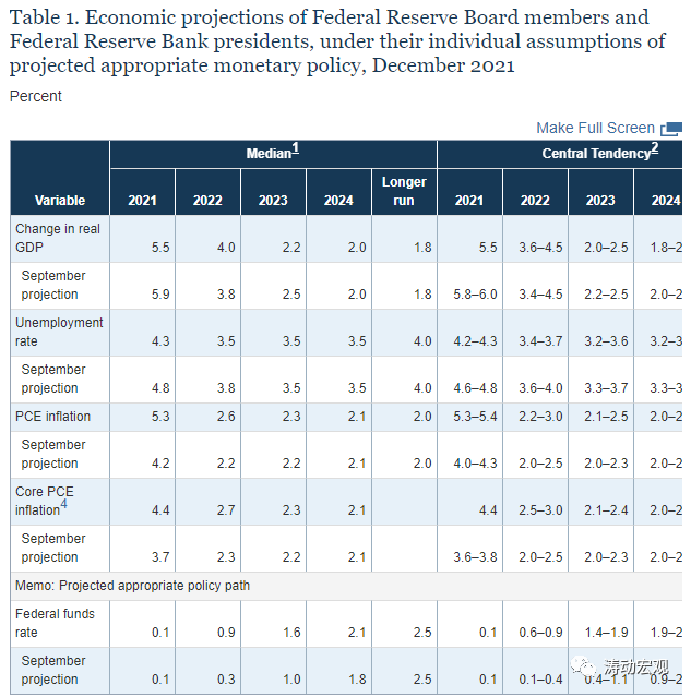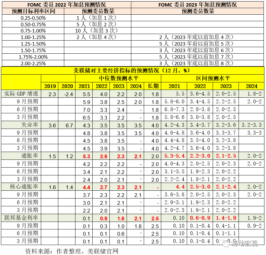 2、大幅上調(diào)了2022-2023年的聯(lián)邦基金利率預(yù)期,將2022年與2023年的聯(lián)邦基金利率預(yù)期區(qū)間分別由9月的0.1-0.4和0.4-1.1提升至0.6-0.9和1.4-1.9,即2022年與2023年聯(lián)邦基金利率分別上調(diào)60-75BP和100BP,也即2022與2023年將分別需要加息3次。
