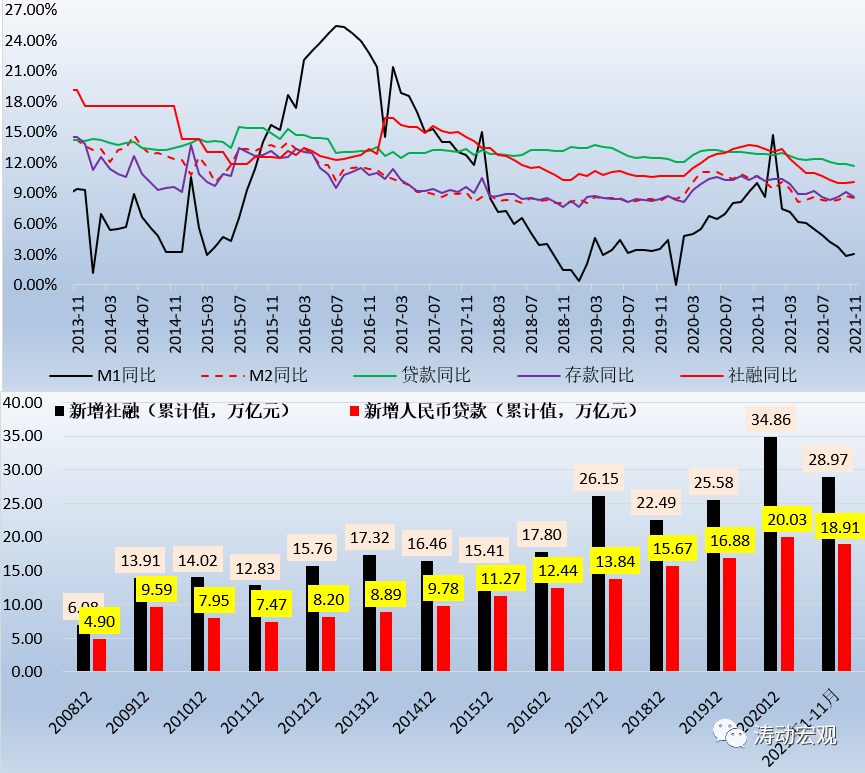 2、11月人民幣貸款、企業(yè)中長期貸款等反映實(shí)體經(jīng)濟(jì)融資需求的指標(biāo)依然偏弱,而社融、M2與人民幣貸款數(shù)值亦明顯低于預(yù)期。