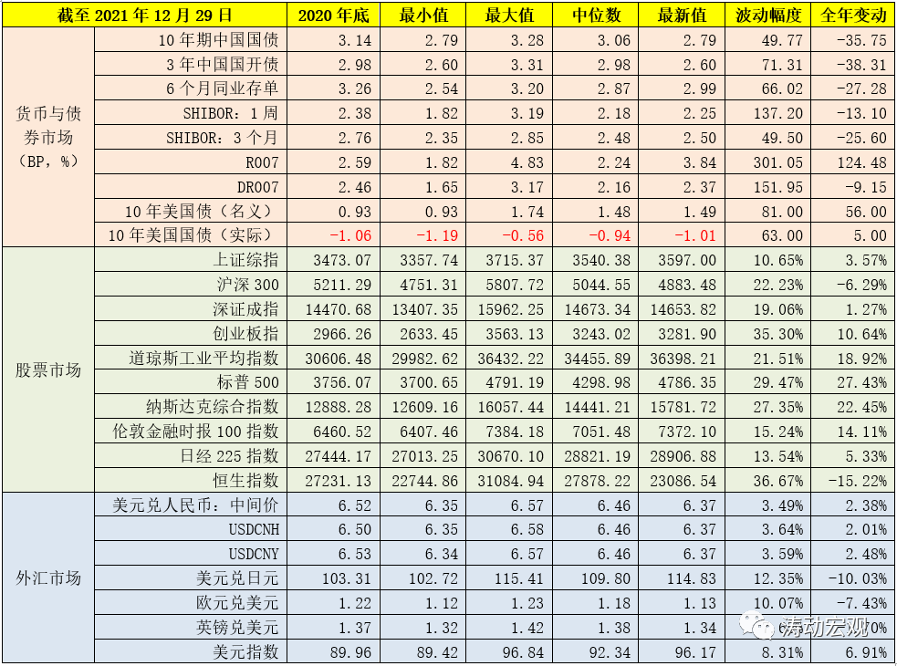 潮起潮落下,一切即將塵埃落定。回望2021年全年,應(yīng)清醒地認(rèn)識(shí)到,當(dāng)前全球經(jīng)濟(jì)只是反彈,還未真正復(fù)蘇,多數(shù)經(jīng)濟(jì)體并未恢復(fù)到疫情前水平,一些問題的存在仍然讓人頭疼,如疫情起伏反復(fù)嚴(yán)重干擾復(fù)蘇進(jìn)程、不同地區(qū)復(fù)蘇分化發(fā)展失衡威脅增長的可持續(xù)性、高企的通脹尚未出現(xiàn)緩解跡象(對(duì)企業(yè)和民眾的困擾需要引起關(guān)注),供應(yīng)鏈產(chǎn)業(yè)鏈?zhǔn)茏璧摹半[患”仍在間歇性發(fā)作、新興經(jīng)濟(jì)體和發(fā)展中國家對(duì)美聯(lián)儲(chǔ)政策節(jié)奏的變化憂心忡忡等等。過去這一年,雖然中國經(jīng)濟(jì)總量即將邁入110萬億元大關(guān)、人均GDP將達(dá)到1.20萬美元(逼近高收入國家水準(zhǔn)),但我們卻經(jīng)歷了經(jīng)濟(jì)基本面的倒“V”型反轉(zhuǎn)和下半年以來的超預(yù)期下行,經(jīng)歷了A股市場(chǎng)近幾年以來表現(xiàn)最為一般的一年(雖然創(chuàng)業(yè)板仍在繼續(xù)大幅上行以及A股全年成交金額突破2015年的紀(jì)錄)以及恒指連續(xù)兩年的下挫,亦經(jīng)歷了2015年以來人民幣匯率波動(dòng)幅度最小的一年(全年不到4%)。同樣是這一年,美聯(lián)儲(chǔ)Taper進(jìn)程明顯加快以及加息步伐預(yù)期明顯提前、美元指數(shù)與美債收益率顯著上行、美國三大股指引領(lǐng)全球,中國與美國之間的第二階段博弈在Biden時(shí)代的第一年迎來了新的特征以及地緣政治格局博弈愈加劇烈。依然是這一年,我們看到雖然中國經(jīng)濟(jì)在疫情之后率先反彈,但在反彈之后經(jīng)濟(jì)基本面亦比其它經(jīng)濟(jì)體率先進(jìn)入下行通道(今年1-3季度的當(dāng)季GDP增速分別為5%、5.50%和4.90%),未來若干年的中國經(jīng)濟(jì)可能均需要為保“5%”而不斷努力,年終政治局會(huì)議與中央經(jīng)濟(jì)工作會(huì)議則相應(yīng)提出“穩(wěn)字當(dāng)頭、穩(wěn)住宏觀經(jīng)濟(jì)大盤”的政策基調(diào),并做出“需求收縮、供給沖擊、預(yù)期轉(zhuǎn)弱”的基本判斷,因?yàn)檎卟块T與市場(chǎng)均應(yīng)認(rèn)識(shí)到,經(jīng)濟(jì)基本面的運(yùn)行是有慣性的且某種程度上不以人的意志為轉(zhuǎn)移,經(jīng)濟(jì)增速一旦落下來,就很難再上去,所以現(xiàn)在要讓它落的慢一些、溫柔一些,從這個(gè)角度看持續(xù)收緊的貨幣環(huán)境應(yīng)已很難重現(xiàn)。還是這一年,城投政策趨嚴(yán)與地產(chǎn)行業(yè)重塑牽動(dòng)著整個(gè)市場(chǎng)的神經(jīng),綠色金融漸成氣候、碳貨幣趨勢(shì)愈發(fā)明顯,新三板、北交所、創(chuàng)業(yè)板與科創(chuàng)板正持續(xù)為科創(chuàng)類企業(yè)提供加持平臺(tái)。