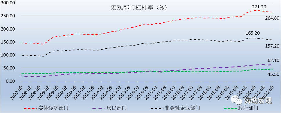相較于2020年的各部門宏觀杠桿率大幅抬升來說,2021年的宏觀杠桿率則有了一定程度的下降,應(yīng)該說這為2022的加杠桿創(chuàng)造了空間。從具體看,2020年實(shí)體經(jīng)濟(jì)部門、居民部門、非金融企業(yè)部門與政府部門的杠桿率分別上升23.60個(gè)百分點(diǎn)、6.10個(gè)百分點(diǎn)、10.40個(gè)百分點(diǎn)和7.10個(gè)百分點(diǎn),2021年前三季度則分別下降了5.30個(gè)百分點(diǎn)、0.10個(gè)百分點(diǎn)、5.10個(gè)百分點(diǎn)和0.10個(gè)百分點(diǎn)。