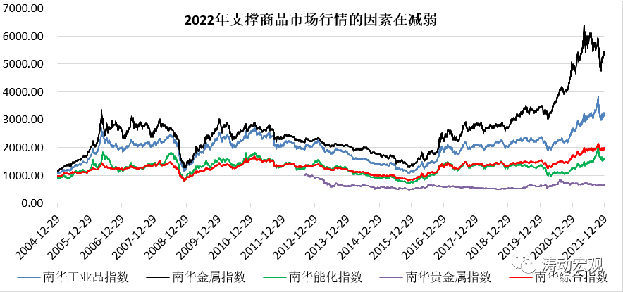 相較于其股債匯市場(chǎng),商品市場(chǎng)與經(jīng)濟(jì)基本面之間的關(guān)聯(lián)性更強(qiáng)。大的周期來看,商品市場(chǎng)的這一波牛市行情持續(xù)時(shí)間較長,主要得益于2015年以來的供給側(cè)改革(去產(chǎn)能)+經(jīng)濟(jì)修復(fù)階段(對(duì)供給收縮與需求修復(fù))的預(yù)期強(qiáng)化。但隨著國內(nèi)經(jīng)濟(jì)基本面的弱化、海外生產(chǎn)的修復(fù)以及政策層面對(duì)炒作大宗商品的打壓,我們認(rèn)為支撐2022年行情大宗商品的因素有所減弱,需要做好心理準(zhǔn)備。