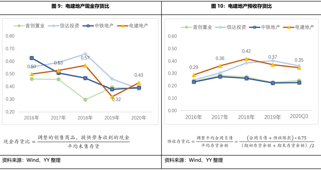 2015-2019年,電建地產有息債務規模持續膨脹,若將永續債納入有息負債范疇,2019年末有息債務達到681.41億元,現金短債比也轉紅,三條紅線均觸線,年末凈負債率為1.03,現金短債比為1.02,剔預負債率和凈負債率雖有所改善,但2020年底仍踩兩條紅線,現金短債比也在觸線邊緣徘徊,暫為橙檔企業。
