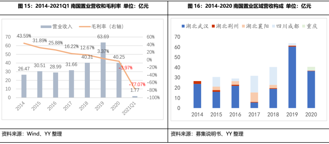 南國置業自2014年起營收規模有所增長,但盈利能力持續下跌,并購后業務開展不暢,疫情打擊雪上加霜。如圖16,被吸并之后南國置業的毛利率一路下探,2019年毛利率已經低至3.37%,業務收入在2014-2018年也只能算是平緩增長,2019年營收沖高,但從盈利情況看業務擴張并不順利,而2016-2019年武漢市房價處于加速上升期,顯然南國置業的經營層面出現了問題,而在新冠疫情的沖擊下,重倉武漢的南國置業2020年更是慘淡。