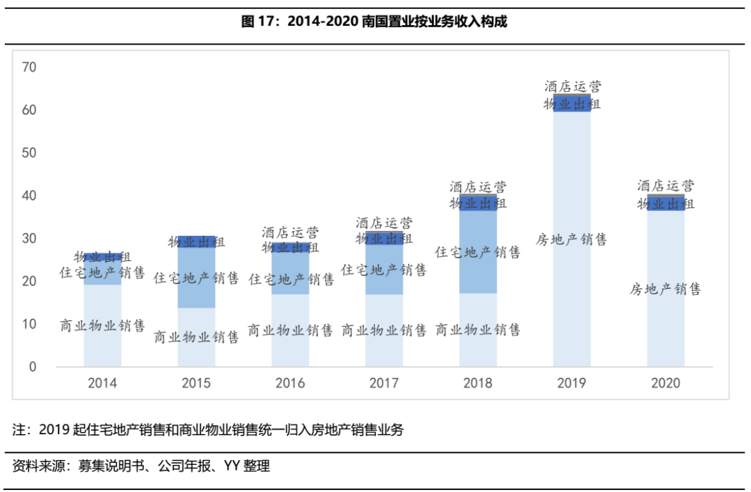 公司聚焦房地產主業,以剛需和改善類住宅為主,商業地產為輔,2014年6 月公司收購南國置業前,公司以住宅地產項目為主,股權收購后,公司進一步拓展商業地產業務,產品覆蓋住宅、寫字樓、酒店等多種業態,形成住宅+地產的業態結構。