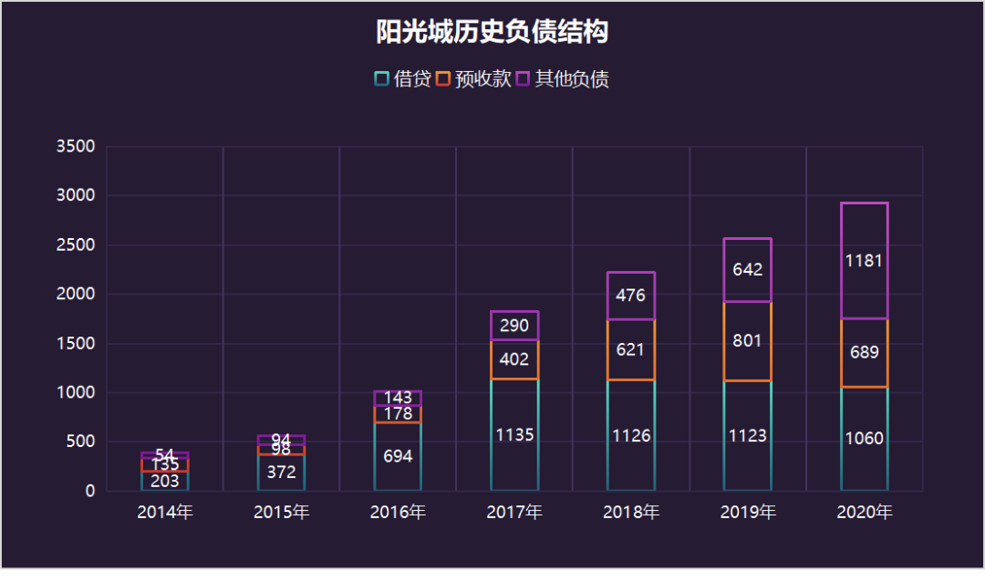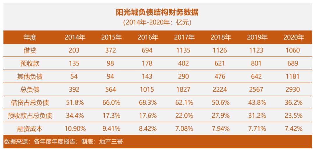 2017年到2020年,陽光城的借款持平略有減少,占總負債比例從68%降低到36%。