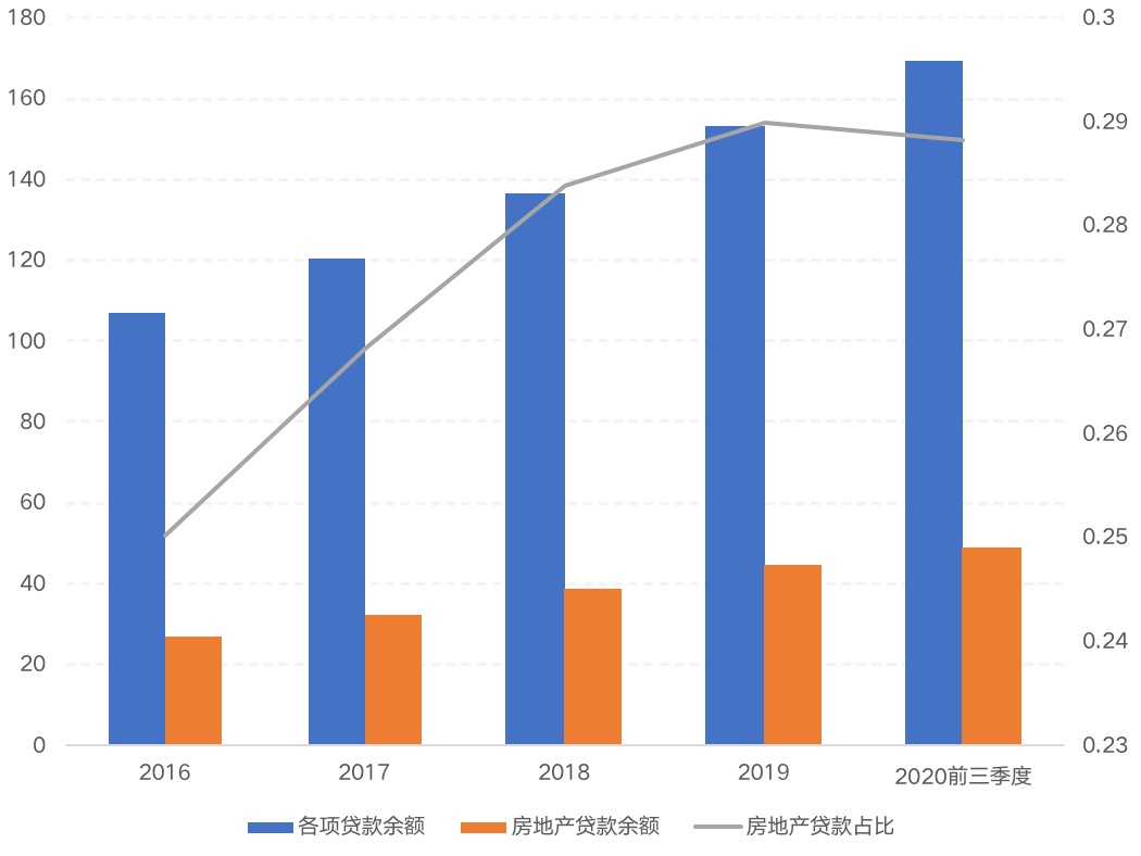 據人民銀行統計的《2020年三季度金融機構貸款投向統計報告》數據顯示,2020年三季度末,金融機構人民幣各項貸款余額169.37萬億元,其中人民幣房地產貸款余額48.83萬億元,房地產貸款占比約28.83%,低于“房地產貸款集中度管理要求”中“第一檔:中資大型銀行”40%占比上限,略高于“第二檔:中資中型銀行”27.5%占比上限。