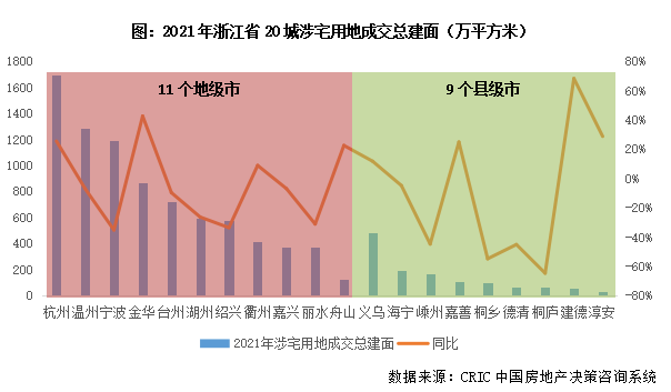 展望2022年,浙江省房地產(chǎn)市場前景很大程度上將取決于供求關(guān)系,聯(lián)系到近兩年浙江省涉宅用地成交規(guī)模持續(xù)下行,預(yù)計房地產(chǎn)市場仍將實現(xiàn)供求平衡。2021年,浙江省11個地級市涉宅用地成交總建面8230萬平方米,同比下降10%,9個縣級市涉宅用地成交總建面1262萬平方米,同比下降21%。