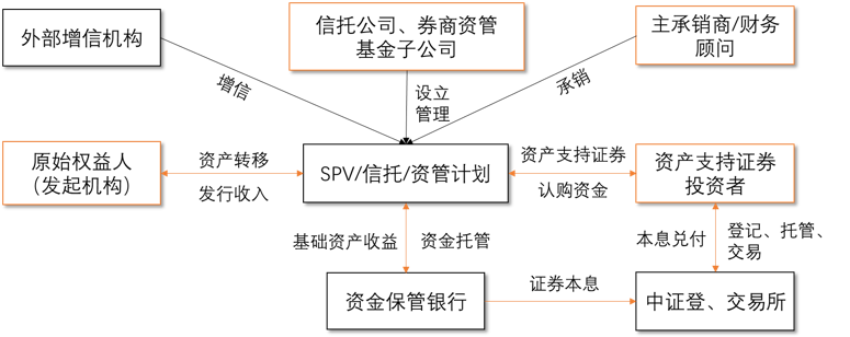 如上圖所示,這個(gè)資產(chǎn)包是一個(gè)特殊目的載體,需要一個(gè)管理人(或叫受托人),通常是信托公司或者其他履行相同職能的類(lèi)似機(jī)構(gòu)(本文討論服務(wù)信托,姑且以信托公司為例)。資產(chǎn)證券化與一般財(cái)產(chǎn)信托的差異就在于,前者在封包并創(chuàng)設(shè)了“信托受益權(quán)”(就是獲得信托財(cái)產(chǎn)和信托利益分配的權(quán)利)后,這個(gè)信托受益權(quán)被標(biāo)準(zhǔn)化、證券化,并公開(kāi)出售給投資者。在資產(chǎn)證券化的交易場(chǎng)景中,我們一般將該“信托”稱(chēng)之為“資產(chǎn)支持計(jì)劃”,對(duì)應(yīng)出售給投資者的權(quán)益憑證稱(chēng)之為“資產(chǎn)支持證券”。