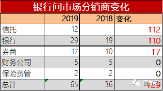 從數量上來看,2019年具有參團分銷資格的市場成員,從2018年初的36家快速上升到65家,其中信托公司和銀行成為新增主力,分別達到12家和10家。背后其實體現的就是微觀經濟學的樸素原理——行業出現超額利潤會吸引更多的競爭者進入,最終會降低行業的整體利潤水平。