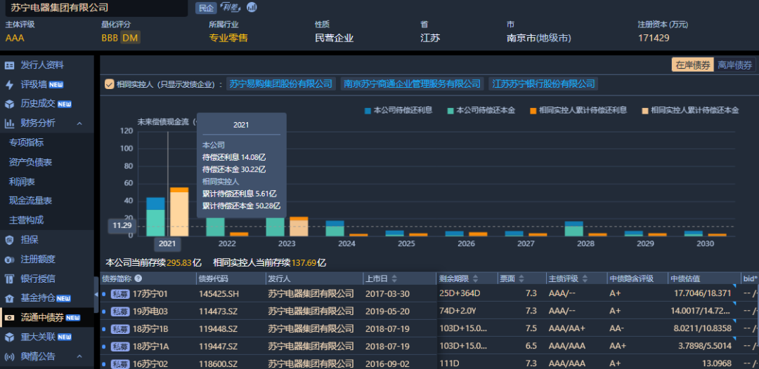 蘇寧電器境內(nèi)債當(dāng)前存續(xù)295.83億,相同實(shí)控人當(dāng)前存續(xù)137.69億。今年到期量超百億(含相同實(shí)控人)。