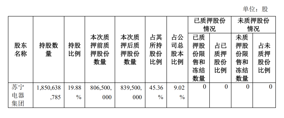 本次質(zhì)押后,蘇寧電器集團(tuán)累計(jì)質(zhì)押約8.4億股公司股份,占公司總股本的9.02%。