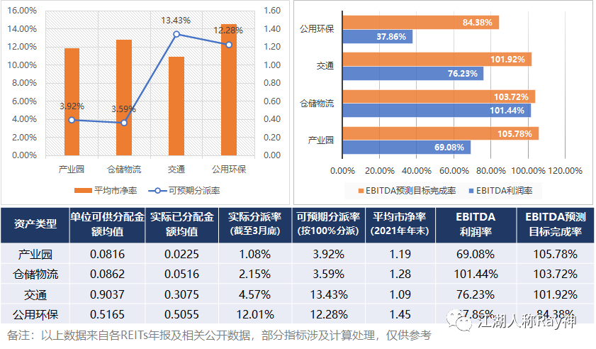 我們再從REITs的底層資產類型來分析一下。目前已發行的最多是基于產業園和高速公路,各有4個;剩下的基于倉儲物流和公用環保類資產的各有2個。我們稍稍統計一下就會發現公用環保類的資產實際分派和市凈率都是最高的。但是,值得注意的是這兩個REITs年報披露的EBITDA利潤率或是其預測目標的完成比例均不及投資其他類型資產的REITs。這也就是說當下分派率高并不一定意味著底層資產的表現優越,而沒有合理收益作支撐的基金溢價后續必將會給投資者帶來風險。