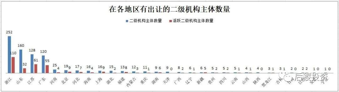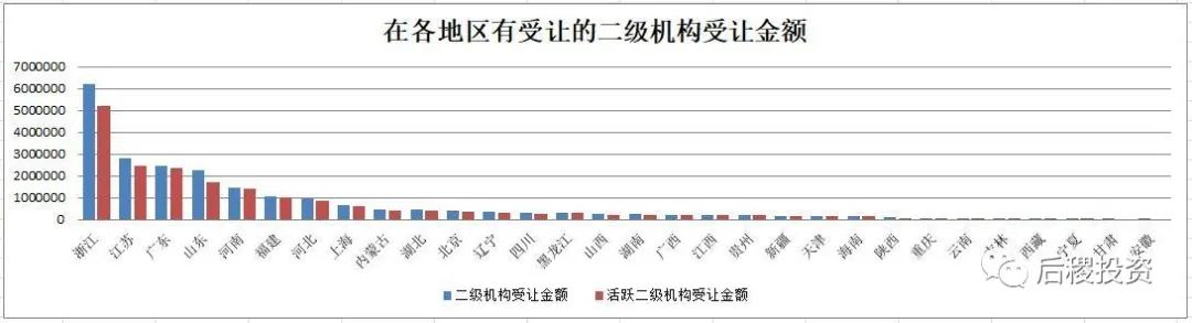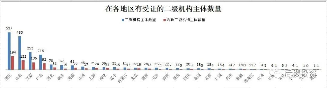 從主體數量上看,二級機構市場參與主體集中在東部地區,其中浙江、江蘇和廣東的活躍二級機構占總二級機構比例均約為50%,而山東的活躍二級機構占比約為20%。而其他地區有出讓記錄的二級機構主體數量零星可數,這一方面是因為相比東部省份,二級機構參與市場成交確實相對較少,另一方面則是因為二級機構轉讓大部分,特別是民營機構并不需要走公告流程,故數據上難以體現。
