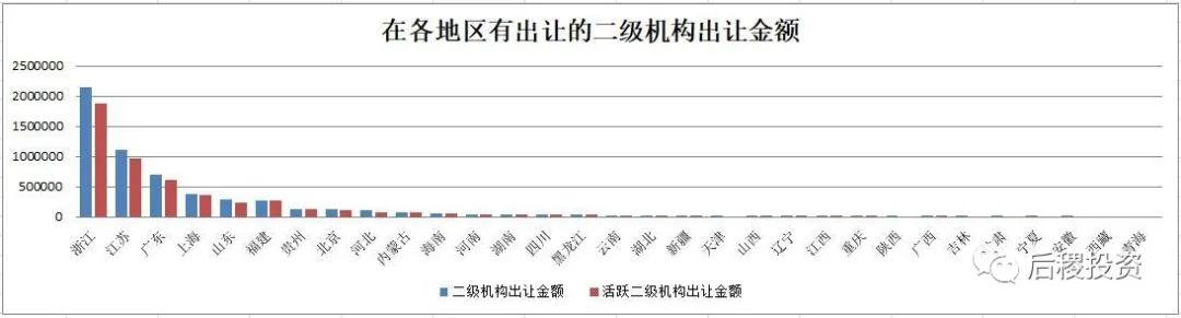 與出讓類似,受讓二級機構主體最多的省份還是浙江、江蘇、廣東和福建,上海的排名有所后移。而活躍二級投資人主體數量占全部二級投資人數量的比例較出讓有下降,這個數據反映了當地二級機構的競爭激烈程度,占比越小的地區,二級機構間的競爭越激烈。