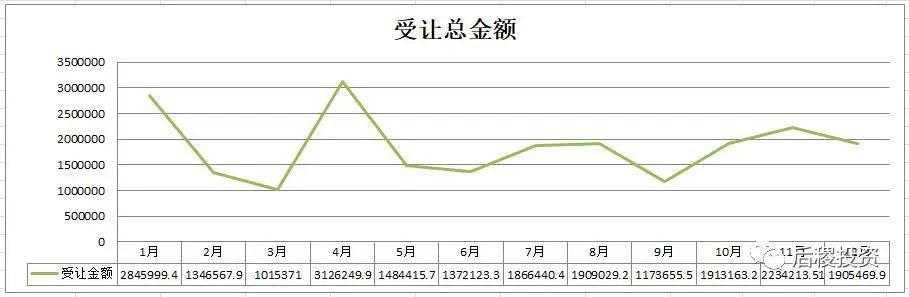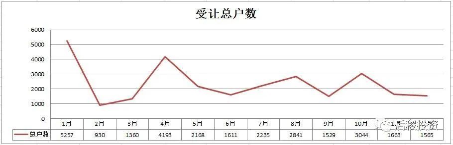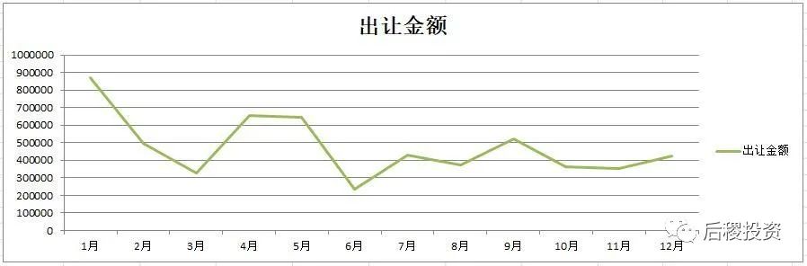 全年1月份出讓份額最高,這是各機構在12月底沖業績,公告反映在1月份。其余時間月出讓次數區間中值為100次,上下浮動40戶以內,戶數中值為750戶,上下浮動250-300戶,金額中值為40億,上下浮動20億。